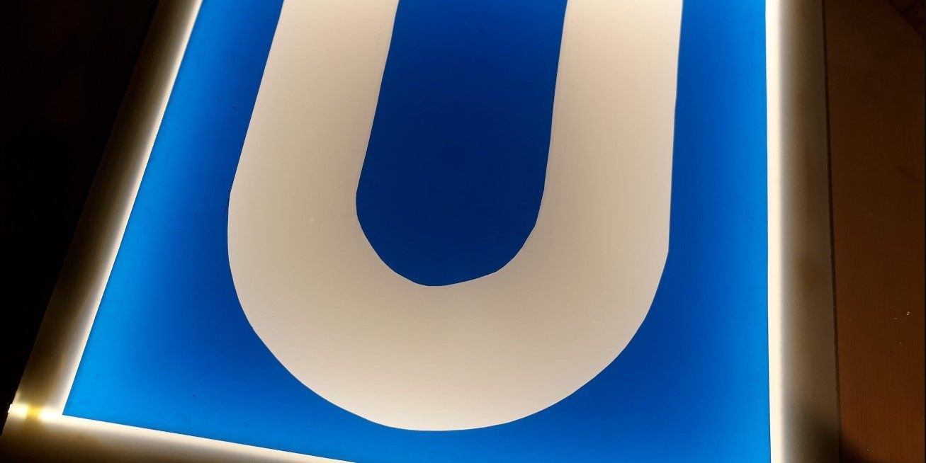 Nun wird der Deckel des Schildes aufgeklebt und mit der entsprechenden Werbefolie beklebt. Im Fall des U-Bahnschildes wurde aus einer blauen Folie ein U ausgeschnitten. Beim Motiv ist darauf zu achten, dass keine Marken oder Urheberrechte verletzt werden.
